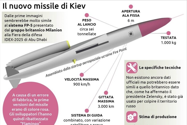 Le sue specifiche tecniche non sono ancora state rese note ufficialmente. Ma il ‘Flamingo’ – il missile con una gittata da 3.000 chilometri che l’Ucraina ha già “testato con successo”, secondo il presidente Volodymyr Zelensky – sarebbe già in produzione e sarebbe già stato impiegato per colpire obiettivi in territorio russo.