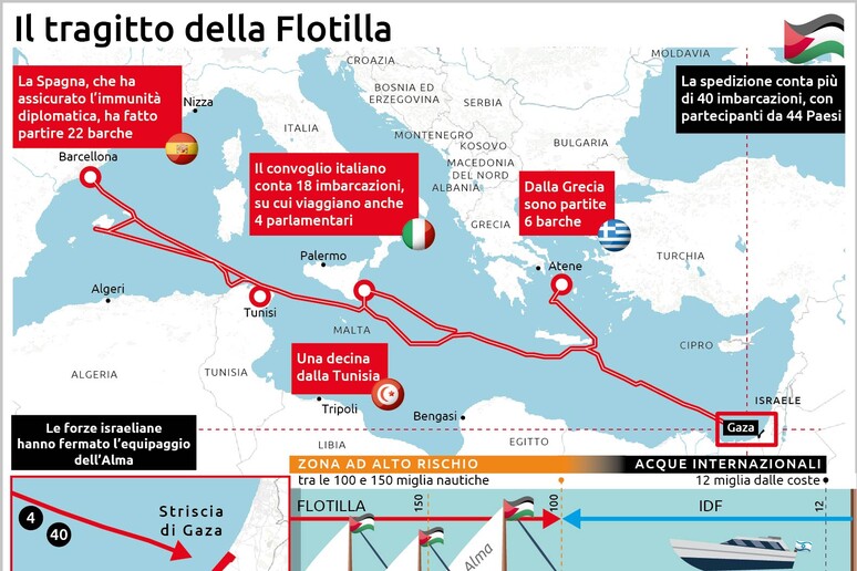 La Global Sumud Flotilla è la missione umanitaria internazionale organizzata da 44 Paesi per portare viveri e aiuti a Gaza e forzare il blocco di Israele. Il convoglio è partito da varie città, anche italiane, tra agosto e settembre, diretto nella Striscia. A bordo alcuni parlamentari italiani, come la deputata Ue Benedetta Scuderi (Avs) e il senatore Marco Croatti (M5s), la deputata Ue Annalisa Corrado e il deputato Arturo Scotto (Pd). Tra gli attivisti anche Greta Thunberg.