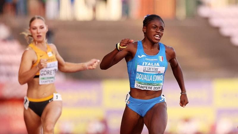 Kelly Doualla travolgente. Un’altra vittoria e un altro titolo sui 100 metri: a quindici anni e 261 giorni è campionessa europea Under 20, vincendo a Tampere con ampio margine in 11’22. Al secondo posto la britannica Mabel Akande con 11’’41, al terzo l’ucraina Uliana Stepaniuk (11’’53) con un solo centesimo sull’azzurra Alice Pagliarini quarta in 11’’54. Grande il tempo di reazione di 0’’115 allo sparo, seguito da una potente fase di raccordo tra l’accelerazione iniziale e la fase lanciata che Doualla ha trasformato in una progressione senza cedimenti fino al traguardo tagliato con un urlo di gioia. Per eguagliare il suo record italiano U20 le è mancato un solo centesimo, ma un altro record lo ha stabilito: mai aveva vinto un’atleta così giovane in 28 edizioni.