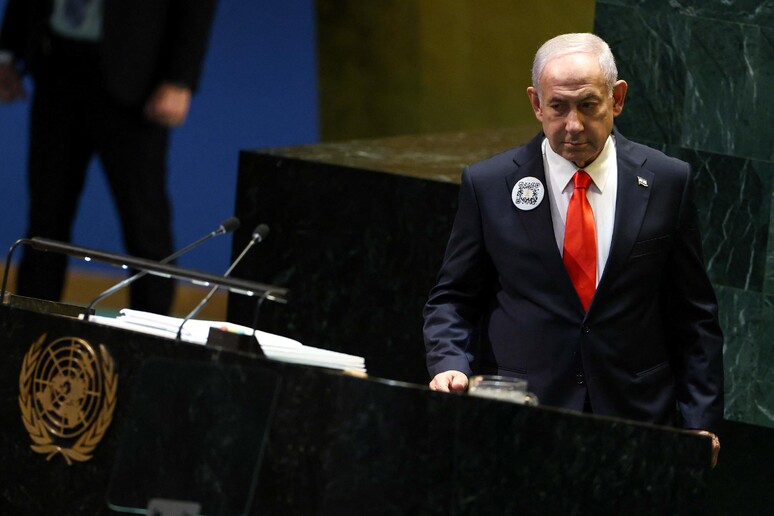 Benjamin Netanyahu nel suo intervento all’Onu indossa una giacca su cui è attaccato un qr code che indirizza al “sito web sulle atrocità” con la documentazione sull’attacco di Hamas del 7 ottobre.